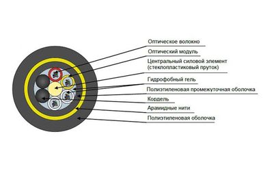 Конструктивно представляет собой повив оптических модулей вокруг стеклопластикового прутка защищенный промежуточной полиэтиленовой оболочкой и слоем арамидных упрочняющих нитей, которые покрыты наружной оболочкой из полиэтилена средней плотности. Свободное пространство в оптических модулях и в сердечнике заполнено гидрофобным гелем.