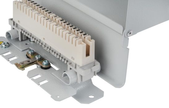 Ввод кабелей осуществляется через вырез в крышке, что упрощает монтаж и позволяет использовать для абонентской разводки не только провода ТРП/ТРВ, но и четырехпарные кабели типа UTP/FTP. Конструкция узла крепления кабелей в коробках обеспечивает надежный электрический контакт с экраном входящего распределительного кабеля, что облегчает его заземление.