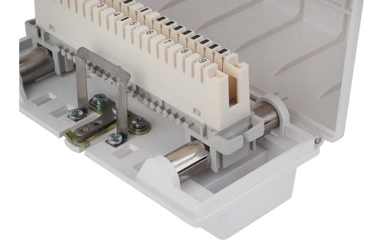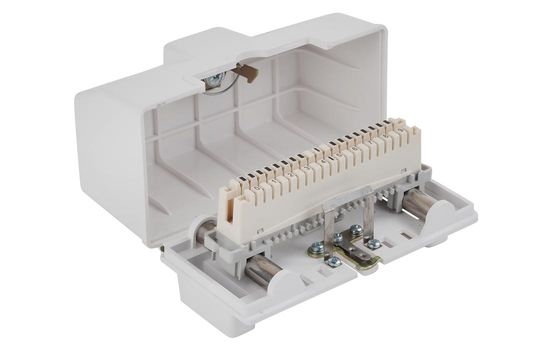 Конструкция узла крепления кабелей в коробках при необходимости обеспечивает надежный электрический контакт с экраном входящего распределительного кабеля, что облегчает его заземление. Ввод кабелей осуществляется через вырез в крышке, что упрощает монтаж и позволяет использовать для абонентской разводки не только провода ТРП/ТРВ, но и четырехпарные кабели типа UTP/FTP.