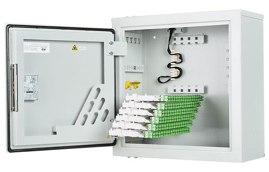 В шкафу предусмотрены несколько монтажных зон. В зоне ввода оптические кабели разделываются и фиксируются. Далее волокна в транспортных трубках поступают в зону монтажа на соответствующий кроссовый модуль. Планарные оптические разветвители устанавливаются в специальные контейнеры на правой боковой стенке шкафа.
