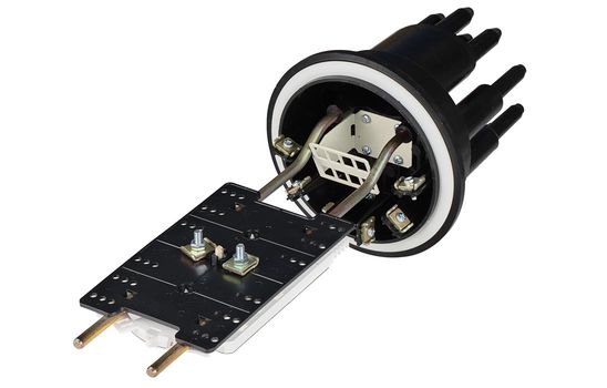 Овальный патрубок муфты может использоваться для одного из перечисленных случаев: 1) ввода транзитной петли кабеля или 2) ввода двух кабелей диаметром до 25 мм. В обоих случаях для герметизации необходимо дополнительно приобрести «Ввод №6».
