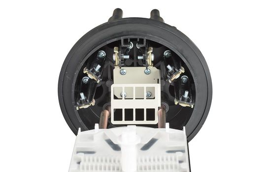 В муфте предусмотрен овальный ввод для транзитной петли оптических модулей без разрезания. Выкладка петли модулей осуществляется на лотке с противоположной стороны от кассет.