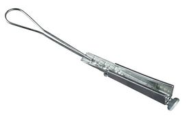 Состоит из открытого корпуса с ребристой контактной поверхностью, клина с прикрепленной проволочной петлей и "терки" - перфорированной вставки, которая прокладывается между кабелем и клином. Конструкция зажима обеспечивает прочное крепление кабеля. Материал изделия – корпус, клин, вставка из оцинкованной стали, петля - из хромированной стали.